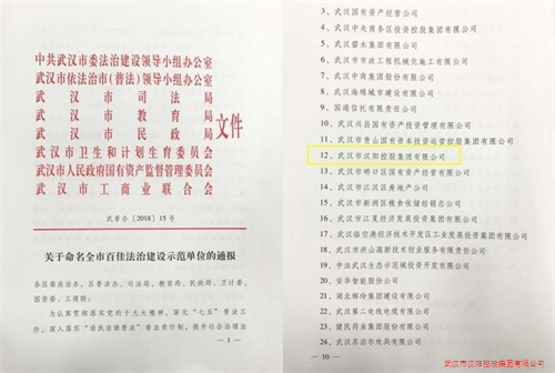 2018年12月25日,武漢市漢陽控股集團(tuán)有限公司迎來一份《關(guān)于命名全市百佳法治建設(shè)示范單位的通報》文件,標(biāo)志著我司法治建設(shè)工作切實(shí)做到有重點(diǎn)、有特點(diǎn)、有亮點(diǎn)、有看點(diǎn)。
