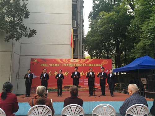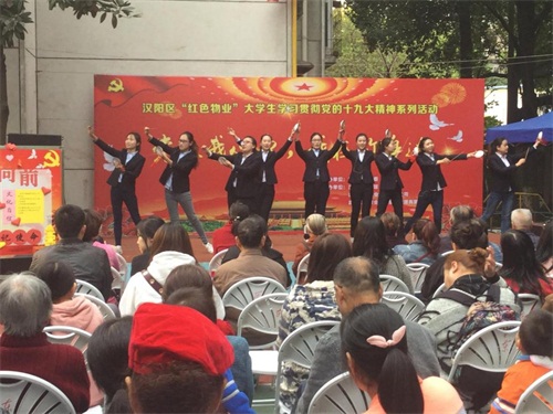 為深入學(xué)習(xí)貫徹黨的十九大精神,發(fā)揮“紅色物業(yè)”大學(xué)生聯(lián)系服務(wù)群眾的優(yōu)勢(shì),推動(dòng)黨的十九大精神進(jìn)社區(qū)、進(jìn)樓棟、進(jìn)家庭,11月10日,在漢陽(yáng)區(qū)委組織部的組織領(lǐng)導(dǎo)下,一場(chǎng)以“黨在我心中,我在你身邊”為主題的文藝活動(dòng)在正陽(yáng)物業(yè)接管的路橋小區(qū)精彩上演。
